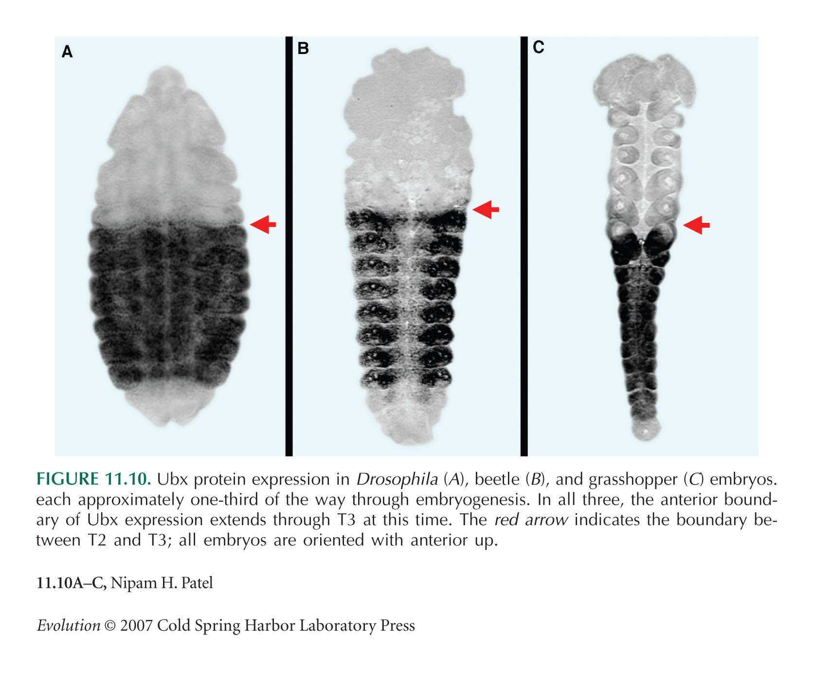 FIGURE 11.10. Ubx expression in Drosophila, beetle, and grasshopper embryos (jpg) (pdf)