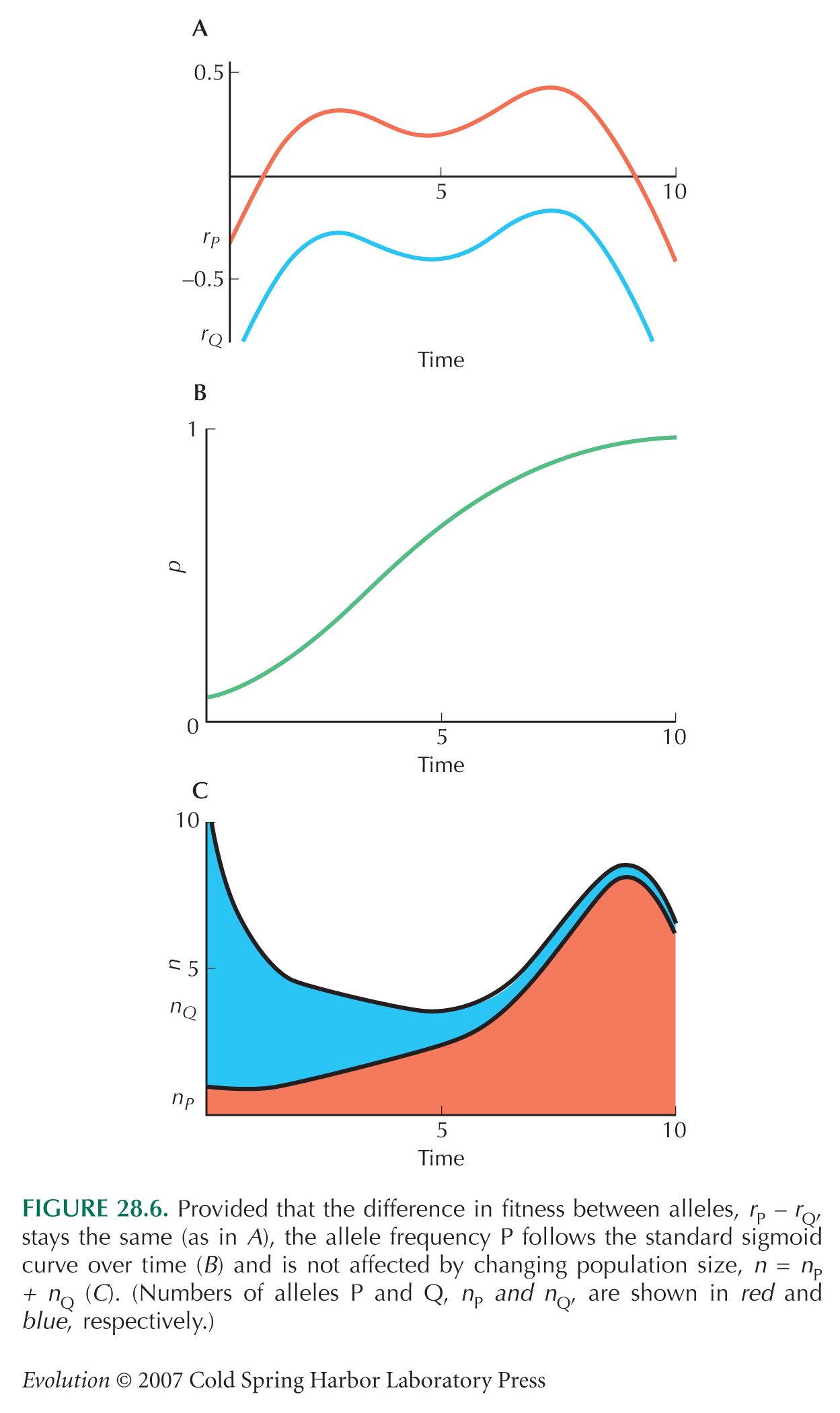 FIGURE 28.6. Difference in fitness between alleles, the allele frequency P, and population size (jpg) (pdf)